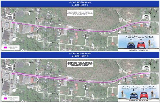 Two alternatives are under consideration. Both would provide a five-foot-wide sidewalk along the south side of KY 40. The second alternative would add a sidewalk on the north side of KY 40 along approximately half the distance of the total project.